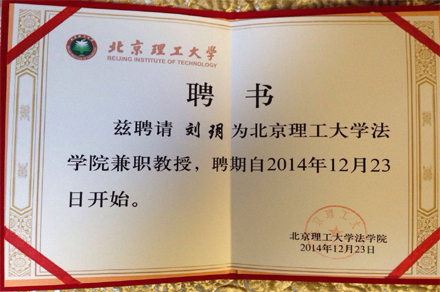 我所律师刘玥,于2014年12月23日受聘为北京理工大学法学院兼职教授,聘用期自2014年12月开始。